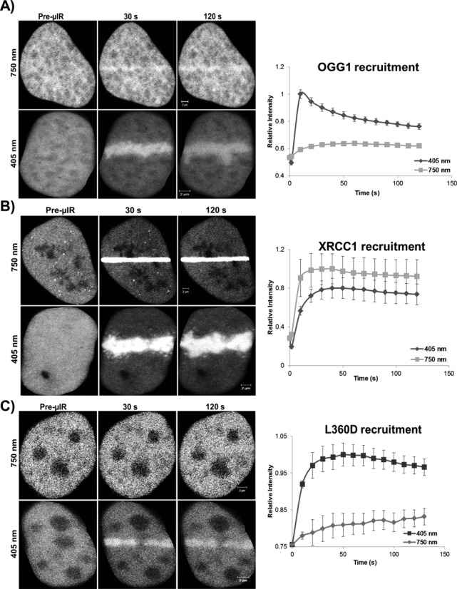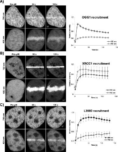Figure 2. Recruitment of OGG1 and XRCC1 under different laser conditions. Recruitment kinetics of (A) the BER protein OGG1, (B) BER/SSBR scaffold protein XRCC1 and (C) XRCC1 mutant L360D were compared following irradiation of HeLa cells expressing pEGFP-OGG1 or wild type or mutant XRCC1-mGFP with either 750-nm multi-photon excitation or 405-nm laser excitation. The recruitment of the XRCC1 mutant, L360D, was tested in cells co-expressing WT XRCC1-mRFP (shown in Supplementary Figure S2). Error bars represent SEM from three independent experiments each analyzing 12 cells (i.e. n = 36). |