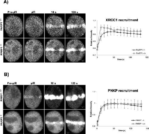 Figure 4. Recruitment of XRCC1 and PNKP in PARP1 WT and KO cells. The recruitment of SSBR proteins was monitored in PARP+/+ and PARP−/− MEFS expressing (A) XRCC1-mGFP and (B) PNKP-mGFP subjected to 750-nm multiphoton micro-irradiation. Error bars represent SEM from three independent experiments for a total of 36 individual cells. |