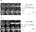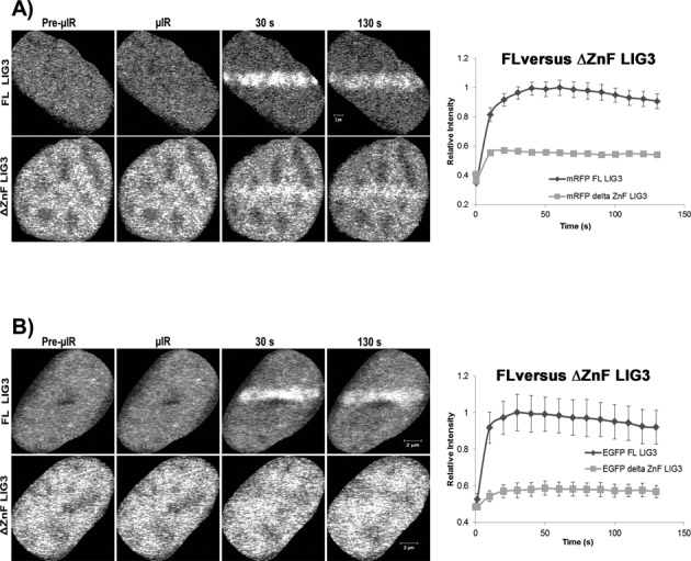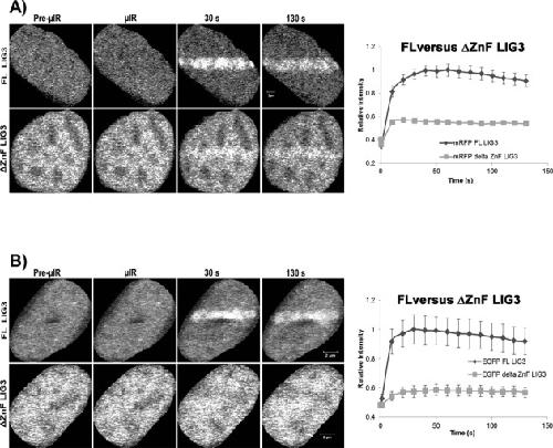Figure 7. Comparison between the recruitment of full-length LIG3 and LIG3 lacking the zinc finger to sites of DNA damage. (A) HeLa cells or (B) EM9 cells expressing full-length (FL) LIG3 or mutant ΔZnF LIG3 were subjected to laser micro-irradiation. In HeLa cells, FL LIG3 was robustly recruited to sites of DNA damage while ΔZnF LIG3 was recruited less efficiently. Furthermore, FL-LIG3 was recruited to sites of DNA damage even in the absence of XRCC1 (EM9 cells) while ΔZnF-LIG3 could not. For recruitment curves, error bars represent SEM; n = 36. Both cell lines were tested with mRFP- and EGFP-tagged proteins and the tags were shown not to influence the result. |