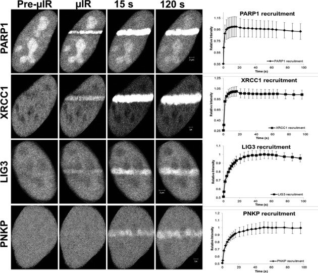 Figure 3. Recruitment and retention of SSBR proteins following multi-photon 750-nm laser micro-irradiation. EGFP-PARP1, XRCC1-mGFP and EGFP-LIG3 show near instantaneous recruitment to sites of DNA damage, and PNKP-mGFP is also rapidly recruited. Laser micro-irradiation using multi-photon 750 nm was carried out as outlined in the Materials and Methods section using HeLa cells expressing fluorescently tagged versions of indicated proteins. Recruitment curves show quantification of signals over the observed time scale starting at the time when the damage is introduced by the laser (t = 0). Error bars represent SEM from three independent experiments for a total of 36 individual cells. |