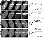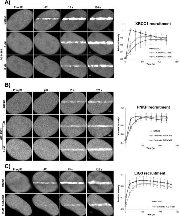 Figure 5. PARP1 inhibition and the recruitment of SSBR proteins to sites of DNA damage. HeLa cells expressing fluorescently tagged SSBR proteins were treated with the PARP inhibitor, AG14361, and then subjected to laser micro-irradiation. PARP inhibition only affected early recruitment events of (A) XRCC1, (B) PNKP and (C) LIG3 with almost no effect on the late events of accumulation of all the proteins at sites of DNA damage. For recruitment curves, error bars represent SEM from three independent experiments for a total of 36 individual cells. |
