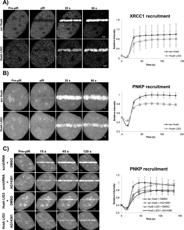 Figure 6. LIG3 knockdown and the recruitment of XRCC1 and PNKP to sites of DNA damage. Laser micro-irradiation was performed on HeLa cells expressing reduced levels of LIG3 (see Supplementary Figure S5) and (A) XRCC1-mRFP or (B) PNKP-mRFP. Reduced background levels of LIG3 lead to decreased overall recruitment of XRCC1 and PNKP to sites of DNA damage. (C) Simultaneous inhibition of PARP1 (using AG14361) and knockdown of LIG3 showed an additive effect on the reduction of the amount of PNKP recruited to sites of DNA damage. For recruitment curves, error bars represent SEM from three independent experiments for a total of 36 individual cells. Note that the mRFP photobleaches during laser micro-irradiation resulting in an initial loss of fluorescence at the damage sites. |