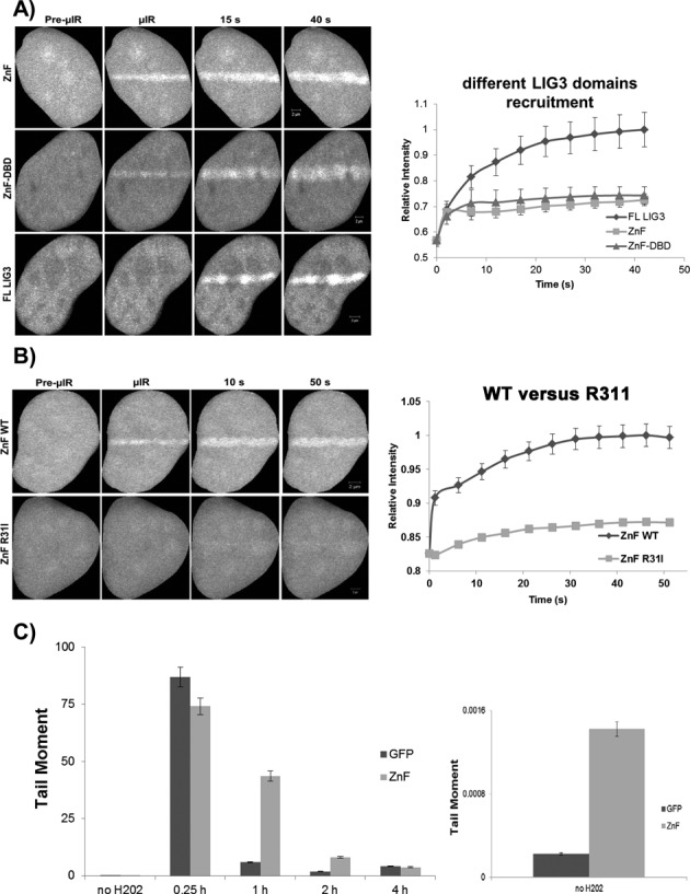 Figure 8. The ZnF domain is required for the damage sensing function of LIG3. (A) Comparison of the recruitment of fluorescently tagged full-length (FL) LIG3 and the ZnF and ZnF-DBD domains of LIG3 to micro-irradiated DNA in HeLa cells. (B) Comparison of recruitment of wild type (WT) and the DNA binding mutant of ZnF-R31I to micro-irradiated DNA in HeLa cells. For recruitment curves shown in (A) and (B), bars represent SEM; n = 36. (C) Expression of the ZnF domain of LIG3 retards single-strand break repair. HeLa cells expressing either the GFP-ZnF or GFP alone (control) were treated with 100 μM hydrogen peroxide for 40 min on ice and then strand break repair was monitored by the alkaline comet assay and quantification of tail moments at the indicated time points as described in the Materials and Methods section. Expanding the ordinate (plot on the right-hand side) showed that even in the absence of the hydrogen peroxide the ZnF expressing cells exhibit a slightly higher background level of damage. |