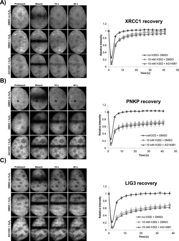 Figure 9. PARP1 inhibition and the retention of SSBR proteins at sites of DNA damage. FRAP analysis on HeLa cells expressing GFP-tagged (A) XRCC1, (B) PNKP and (C) LIG3, respectively, before and after DNA damage with 10 mM hydrogen peroxide in the absence and presence of 2 μM AG14361 as described in the Materials and Methods section. ‘Prebleach’ indicates no photobleaching and ‘Bleach’ is the 0-s time point. For recovery curves, error bars represent SEM; n = 24. |