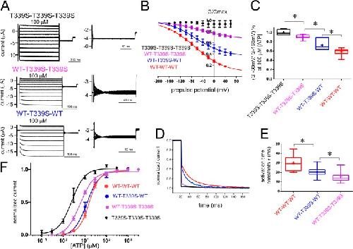 Cao, Thr339-to-serine substitution in rat P2X2 receptor second transmembrane domain causes constitutive opening and indicates a gating role for Lys308. 2007, Pubmed