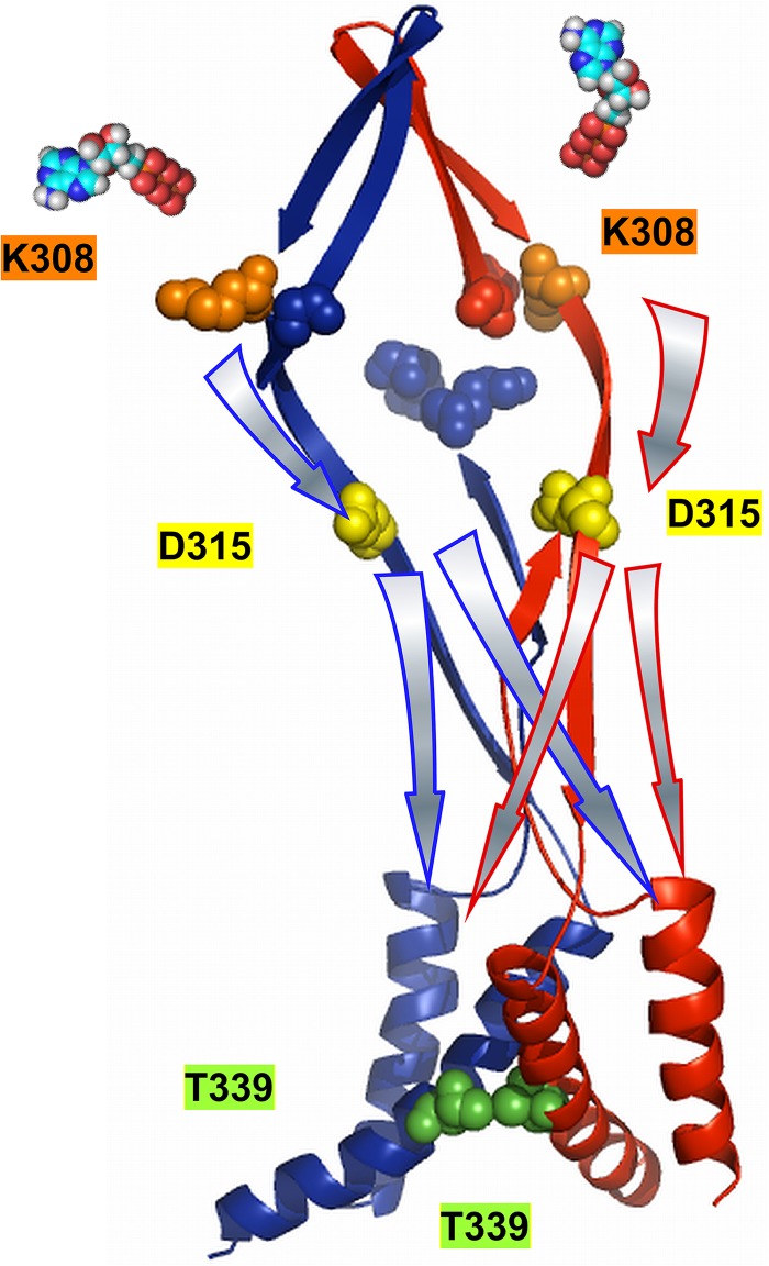P2X2 receptor channel, a homotrimer activated by the binding of extracellular adenosine triphosphate (ATP) to three intersubunit ATP-binding sites (each located ∼50 Å from the ion permeation pore), also shows voltage-dependent activation upon hyperpolarization. Here, we used tandem trimeric constructs (TTCs) harboring critical mutations at the ATP-binding, linker, and pore regions to investigate how the ATP activation signal is transmitted within the trimer and how signals generated by ATP and hyperpolarization converge. Analysis of voltage- and [ATP]-dependent gating in these TTCs showed that: (a) Voltage- and [ATP]-dependent gating of P2X2 requires binding of at least two ATP molecules. (b) D315A mutation in the β-14 strand of the linker region connecting the ATP-binding domains to the pore-forming helices induces two different gating modes; this requires the presence of the D315A mutation in at least two subunits. (c) The T339S mutation in the pore domains of all three subunits abolishes the voltage dependence of P2X2 gating in saturating [ATP], making P2X2 equally active at all membrane potentials. Increasing the number of T339S mutations in the TTC results in gradual changes in the voltage dependence of gating from that of the wild-type channel, suggesting equal and independent contributions of the subunits at the pore level. (d) Voltage- and [ATP]-dependent gating in TTCs differs depending on the location of one D315A relative to one K308A that blocks the ATP binding and downstream signal transmission. (e) Voltage- and [ATP]-dependent gating does not depend on where one T339S is located relative to K308A (or D315A). Our results suggest that each intersubunit ATP-binding signal is directly transmitted on the same subunit to the level of D315 via the domain that contributes K308 to the β-14 strand. The signal subsequently spreads equally to all three subunits at the level of the pore, resulting in symmetric and independent contributions of the three subunits to pore opening.
