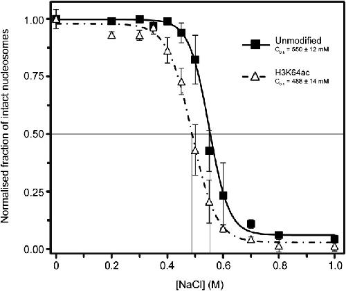 Figure 5—figure supplement 3. Single-molecule analysis of unmodified and H3K64ac salt-dependent nucleosome stability.The fraction of intact nucleosomes at each salt concentration was normalized to the fraction at 0 mM NaCl. Every data point is the average (±SD) of at least three measurements. The data were fit with a sigmoidal function to determine the NaCl concentrations at which the FRET signal is 0.5 (C0.5, see Supplemental methods).DOI: