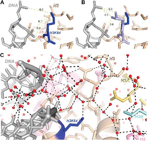 Figure 5—figure supplement 5. Structural analysis of H3K64 interactions.(A) Distances in Å between DNA backbone phosphate oxygen atoms and H3K64 main-chain amide (red text) or terminal nitrogen atoms (black text) in the high-resolution (1.9 Å) crystal structure of the nucleosome (PDB ID 1KX5). The H3K64 main-chain amide directly interacts with the DNA phosphate backbone, this places the H3K64 side-chain within a range to form direct interactions with the DNA. The measured distances are shown as yellow-dashed lines. (B) Two alternate side-chain rotamer conformations of H3K64 (light blue) are shown that demonstrate that the H3K64 side-chain has the potential to form direct ionic interactions with the DNA phosphate backbone. (C) The side-chain of H3K64 is part of an extensive water-mediated hydrogen bonding network between histones and DNA in the high-resolution crystal structure of the nucleosome (PDB ID 1KX5). Water atoms are shown as red spheres and hydrogen bonds as dashed black lines. Each of the displayed hydrogen bonds can be traced back to the water molecule bound to H3K64.DOI: