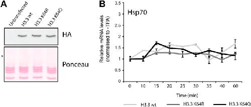 Figure 6—figure supplement 3. Controls for H3.3 expression and gene induction.(A) Anti-HA immunoblot (top) shows that the generated NIH3T3 stable cell lines express each of the exogenous FlagHA-H3.3 types (wt, K64R, or K64Q). Untransfected control is used for signal specificity; ponceau staining is used for loading control; asterisk indicates the molecular size of the FlagHA-H3.3 shifted upwards compared to endogenous H3. (B) Expression of the negative control gene Hsp70 upon TPA induction. Hsp70 is inducible only by heat shock and its expression does not significantly vary among each stable cell line upon TPA stimulation.DOI: