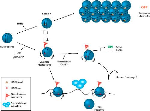 Figure 7. Schematic model for H3K64ac function.H3K64ac (bottom) helps to create an open, permissive chromatin environment. In contrast to this H3K64me3 could lock the nucleosomes in a stable, repressive conformation (top), resulting in an inactive chromatin environment. H3K64ac can directly act by affecting nucleosome dynamics, but also indirectly by blocking methylation of the same residue.DOI: