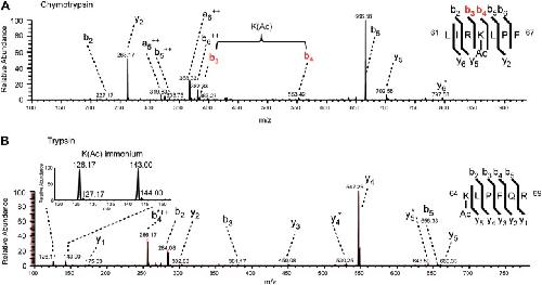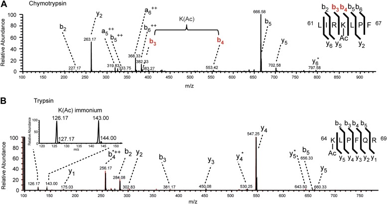 http://dx.doi.org/10.7554/eLife.01632.003Figure 1—figure supplement 1. MS/MS spectra of H3K64ac peptides.CID MS/MS spectra of a chymotryptic (LIRK(ac)LPF; m/z [MH22+] 464.80363) and a tryptic (K(ac)LPFQR; m/z [MH22+] 415.74823) peptide (A and B panels, respectively) derived from endogenous histone H3 demonstrating the acetylation of K64. The mass difference between the b4 and b3 ion of the chymotryptic peptide LIRK(ac)LPF indicates the presence of acetyl-lysine. This is further corroborated by the virtually identical MS/MS spectral overlay of the tryptic peptide K(ac)LPFQR (see also Figure 1) either derived from endogenous H3 (illustrated in black) or the synthetic peptide STELLIRK(ac)LPFQRLVGC(amide) (highlighted in red).DOI: