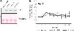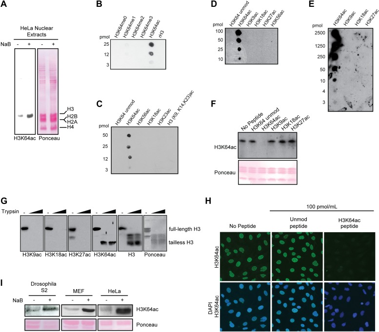 Figure 1—figure supplement 2. Anti-H3K64ac antibody validation.(A) Western blot analysis with H3K64ac antibody (left panel) on nuclear extracts from untreated (−) or Na-butyrate-treated (+) HeLa cells. Ponceau staining is shown as loading control (right panel). (B), (C), (D), and (E) Immuno-dot blots showing specific reactivity of the H3K64ac antibody. Aliquots of indicated pmoles of linear H3 peptides were spotted on the membrane. Of note, detection of peptides in (E) has been checked with H3K9ac, H3K18ac, and H3K27ac specific antibodies. (F) Peptide competition assay of H3K64ac immunoblot. H3K64ac antibody was pre-adsorbed with 50 pmoles/ml of indicated peptides. Ponceau staining is shown as loading control (bottom panel). (G) The H3K64ac antibody detects globular, tailless H3. Nucleosomes from NIH3T3 cells were incubated with no (−) or increasing amounts of trypsin to cleave the histone tails and immunoblotted as indicated for H3K9ac, H3K18ac, H3K27ac, H3K64ac and H3. The position of full-length and tailless H3 is indicated and loading was controlled by ponceau staining. (H) Peptide competition assay in immunofluorescence. MEFs were treated overnight with Na-butyrate (NaB) and then stained with H3K64ac antibody, pre-incubated with 100 pmoles/ml of either unmodified or acetylated K64 peptide. (I) Immunoblot analysis of H3K64 acetylation state in additional cell lines (Drosophila S2, mouse MEFs, human HeLa) with H3K64ac antibody. Inhibition of HDACs by Na-butyrate treatment increases acetylation levels. Ponceau staining is shown as loading control (bottom panel).DOI: