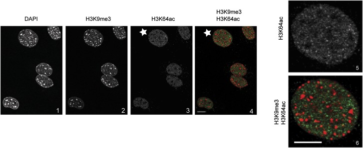 Figure 1—figure supplement 3. H3K64ac is excluded from heterochromatic foci.DAPI dense foci (panel 1) represent pericentric heterochromatin where H3K9me3 is enriched and H3K64ac excluded (compare panels 2, 3 with 4 and panels 5 with 6, representing a magnified view of the cell indicated by a white star). In panel 4 and 6 H3K9me3 appears in red and H3K64ac in green. Shown are single sections, scale bar, 10 µm.DOI: