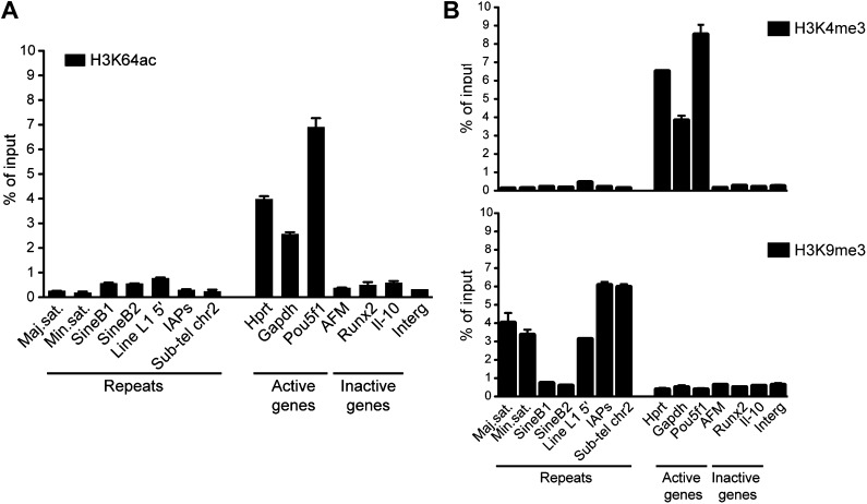 Figure 2—figure supplement 2. Genome-wide data validation by ChIP-qPCR.(A) Native ChIP analysis of H3K64ac on different genomic regions in mouse ES cells. H3K64ac is enriched at the TSS of active genes, but depleted from inactive genes and repeats. (B) Native ChIP analysis performed as in (A). As expected the active H3K4me3 mark is enriched at active genes, but depleted from inactive genes and repeats, in an exact opposite manner to H3K9me3 enriched in repetitive regions.DOI: