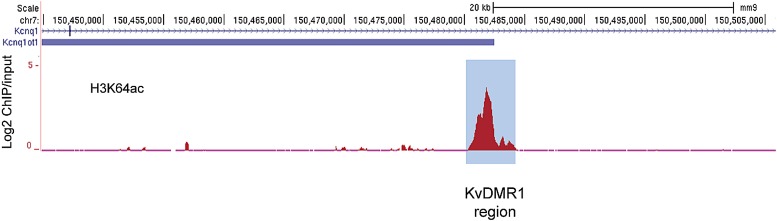 Figure 3—figure supplement 2. The active alleles of ICRs are specifically marked by H3K64ac.UCSC browser screenshots of H3K64ac enrichment at the KvDMR1 ICR region in mouse ES cells validating enrichment at ICRs. Shown are the log2 values of ChIP/input measurements.DOI: