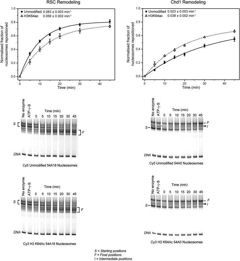 Figure 5—figure supplement 2. Effect of H3K64ac on repositioning by RSC and Chd1.RSC or Chd1 were incubated with a mixture containing equal amounts of differentially fluorescent-labeled nucleosomes: unmodified (Cy5), H3K64ac (Cy3). Bottom panels show representative native PAGEs used to calculate the relative rates of remodeling by RSC and Chd1. Top panels show the relative rates of remodeling determined by fitting the data with a single exponential function (solid line for unmodified, dashed line for H3K64ac). The rates of nucleosome positioning (±s.e.) calculated from three independent remodeling reactions are shown.DOI: