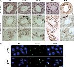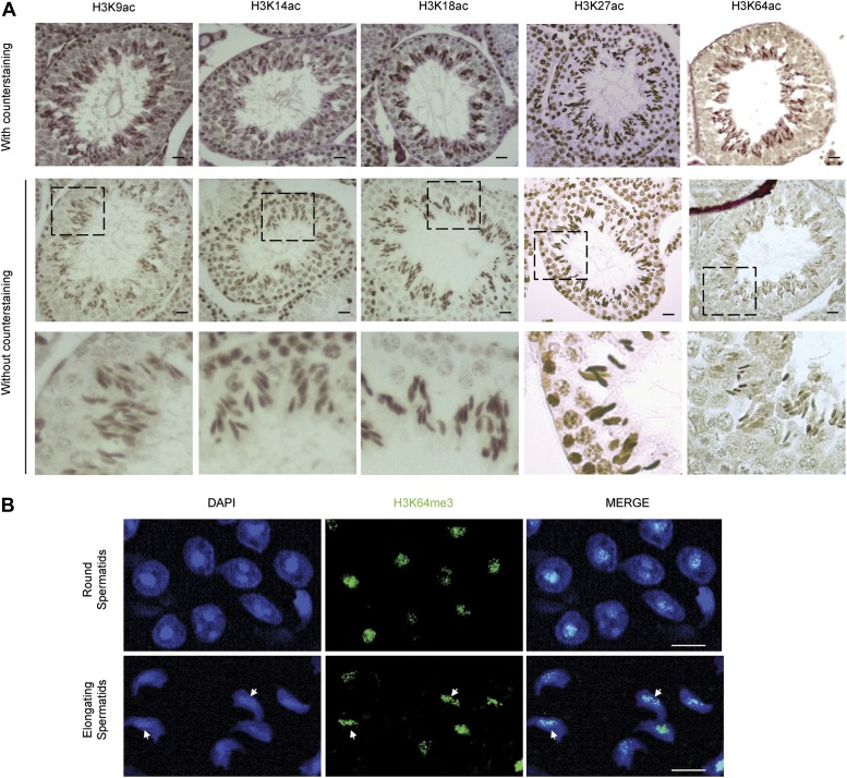 Figure 5—figure supplement 4. H3 acetylation and H3K64me3 stainings in spermatogenesis.(A) Immunohistochemistry (IHC) stainings on sections of mouse testis tubules for different acetylation sites on H3. Note that modification shows distinct patterns of enrichment across the differentiation stages of spermatocytes. Top panels show the specific antibody staining (brown) together with the counterstaining (eosin, red). In the middle planels, only the staining from each specific antibody (brown) is shown. The area in the dashed-line box is magnified 3X in the bottom panel. Scale bar, 20 μm. (B) Immunofluorescence on sections of mouse testis tubules. H3K64me3 signal is strongly detected in the chromocenter of round spermatids as well as in elongating spermatids, in particular at regions where histone replacement occurs late (arrows), scale bar, 5 µm.DOI: