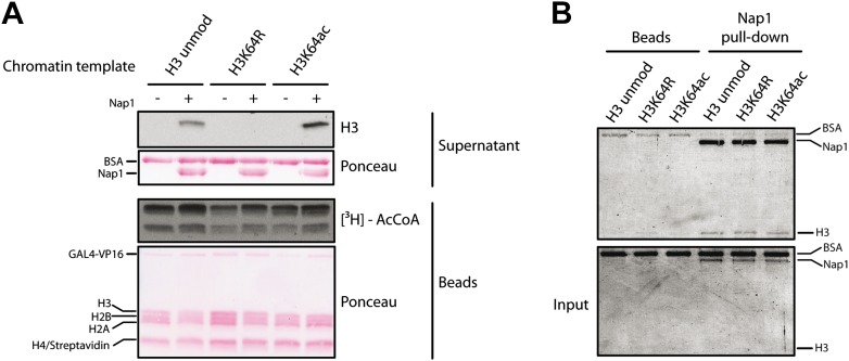 Figure 6—figure supplement 2. Control experiments for the eviction assay involving the role of Nap1.(A) Eviction assay performed as described in the Figure 6A, but comparing the effect of Nap1 (+/− Nap1). Anti-H3 immunoblot of the supernatant fraction shows that the presence of Nap1 is essential for this assay. Ponceau staining as loading control and autoradiography (3H-acetyl-CoA incorporation) on the immobilized fraction as control for p300 activity are shown. (B) Coomassie staining of the Nap1 pull-down of each H3 species showing that Nap1 binds equally unmodified, K64R, or K64ac H3s. Top gel shows the pull-down material from Ni2+ beads with or without Nap1; bottom gel shows the input before the pull-down, as control.DOI:
