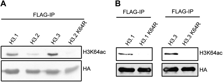 http://dx.doi.org/10.7554/eLife.01632.010Figure 3—figure supplement 1. Immunoblots of H3K64ac distribution among H3 variants.(A) Representative immunoblot of Flag-immunoprecipitated H3 variants, probed with H3K64ac antibody (top panel) and HA antibody as loading control (bottom panel). An antibody control lane with an H3.2K64R mutant is also shown. (B) Antibody specificity was verified using H3.1K64R and H3.3K64R point mutants. Flag immunoprecipitated K64R mutants or wt variants were probed with H3K64ac antibody (top), and anti-HA antibody as loading control (bottom).DOI: