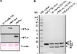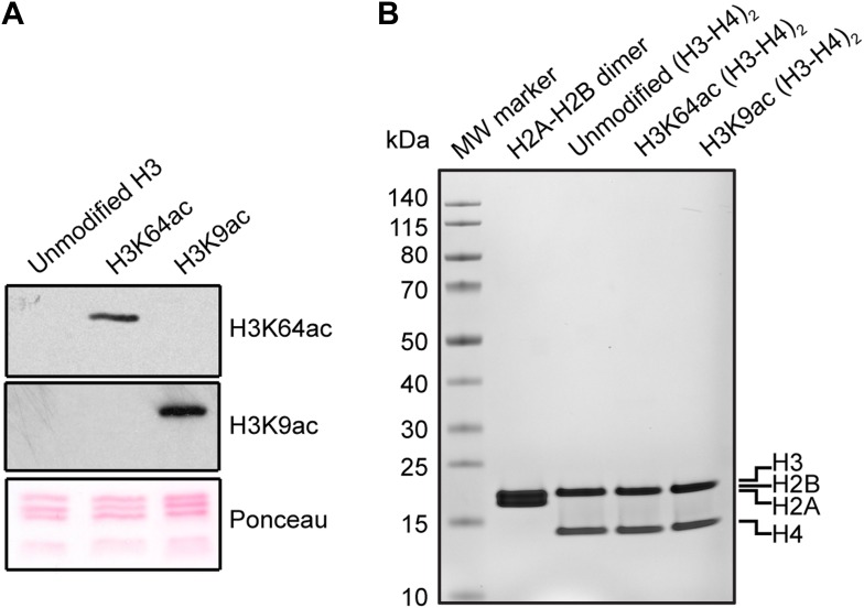 http://dx.doi.org/10.7554/eLife.01632.015Figure 5—figure supplement 1. Validation of the substrates used in the in vitro assays.(A) Validation of H3 acetylation on the octamer substrates used in the in vitro assays. The immunoblots show the acetylation levels of the reconstituted octamers specifically acetylated either on H3K64 or H3K9 compared with the unmodified H3. Ponceau staining is shown as loading control. (B) Staining of protein gel used to check that equal amounts of proteins had been used in the experiments and to assess H2A–H2B dimer, as well as unmodified, H3K64ac, and H3K9ac tetramer qualities.DOI: