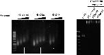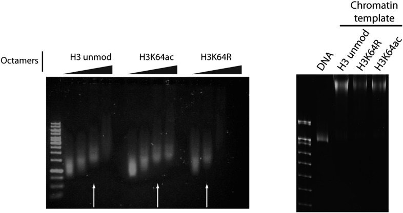 http://dx.doi.org/10.7554/eLife.01632.021Figure 6—figure supplement 1. Validation of the chromatin templates used in the in vitro assay.Representative gels for chromatin assembly onto pG5-MLP promoter DNA fragment (≈ 680 bp). Ethidium bromide staining of a 0.8% agarose gel (left) showing chromatin reconstitution efficiency at different octamer:DNA ratios. Comparable chromatin templates were selected and used in the assays (arrows). Ethidium bromide staining of native 5% polyacrylamide gel (right) shows that comparable chromatin templates were used in the assays.DOI: