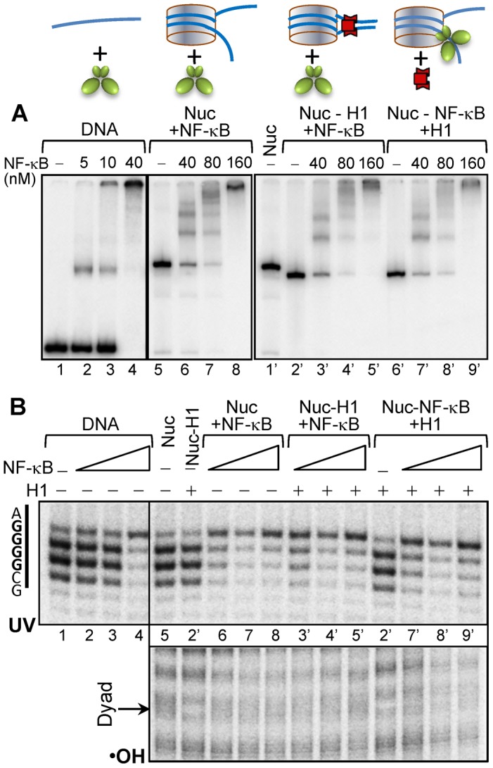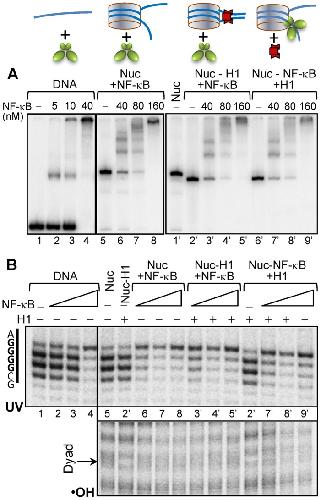 NF-κB is a key transcription factor regulating the expression of inflammatory responsive genes. How NF-κB binds to naked DNA templates is well documented, but how it interacts with chromatin is far from being clear. Here we used a combination of UV laser footprinting, hydroxyl footprinting and electrophoretic mobility shift assay to investigate the binding of NF-κB to nucleosomal templates. We show that NF-κB p50 homodimer is able to bind to its recognition sequence, when it is localized at the edge of the core particle, but not when the recognition sequence is at the interior of the nucleosome. Remodeling of the nucleosome by the chromatin remodeling machine RSC was not sufficient to allow binding of NF-κB to its recognition sequence located in the vicinity of the nucleosome dyad, but RSC-induced histone octamer sliding allowed clearly detectable binding of NF-κB with the slid particle. Importantly, nucleosome dilution-driven removal of H2A-H2B dimer led to complete accessibility of the site located close to the dyad to NF-κB. Finally, we found that NF-κB was able to displace histone H1 and prevent its binding to nucleosome. These data provide important insight on the role of chromatin structure in the regulation of transcription of NF-κB dependent genes.