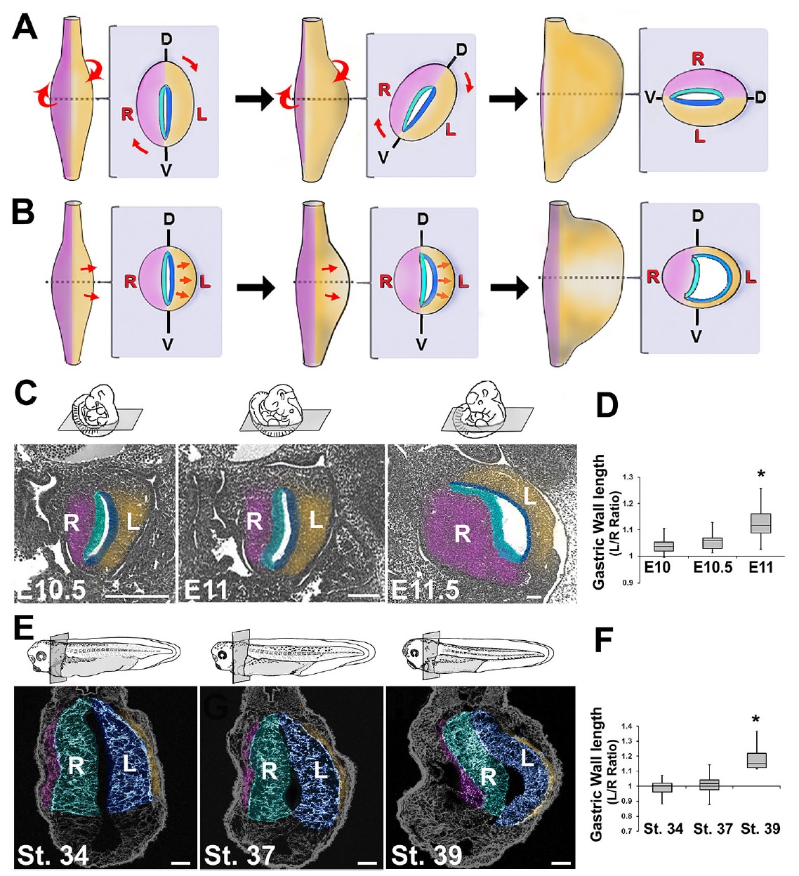 Fig. 1. Early stomach undergoes leftward expansion. The rotation model (A) posits that the embryonic stomach (shown in ventral views and cross-sections at successive stages) rotates around its longitudinal axis, shifting its dorsal face leftward. An alternative model (B) theorizes that the left wall expands more than the right. Sections of E10.5, E11 and E11.5 mouse embryos (C) or stage 34, 37 and 39 frog embryos (E) reveal the leftward expansion of the early stomach. The left/ right ratio of the lengths of the stomach walls becomes significantly greater than 1 in mouse by E11 (D) and in frog by stage 39 (F); *P<0.05. Sections in C and E are false-colored to match diagrams in A and B, highlighting layers of the stomach: right mesoderm, pink; right endoderm, teal; left endoderm, blue; left mesoderm, gold. In all sections, dorsal is upwards and the left side of animal is on right side of image. D, dorsal; V, ventral; L, left; R, right. Scale bars: 500 μm in C (E11.5, 150 μm); 75 μM in E. |