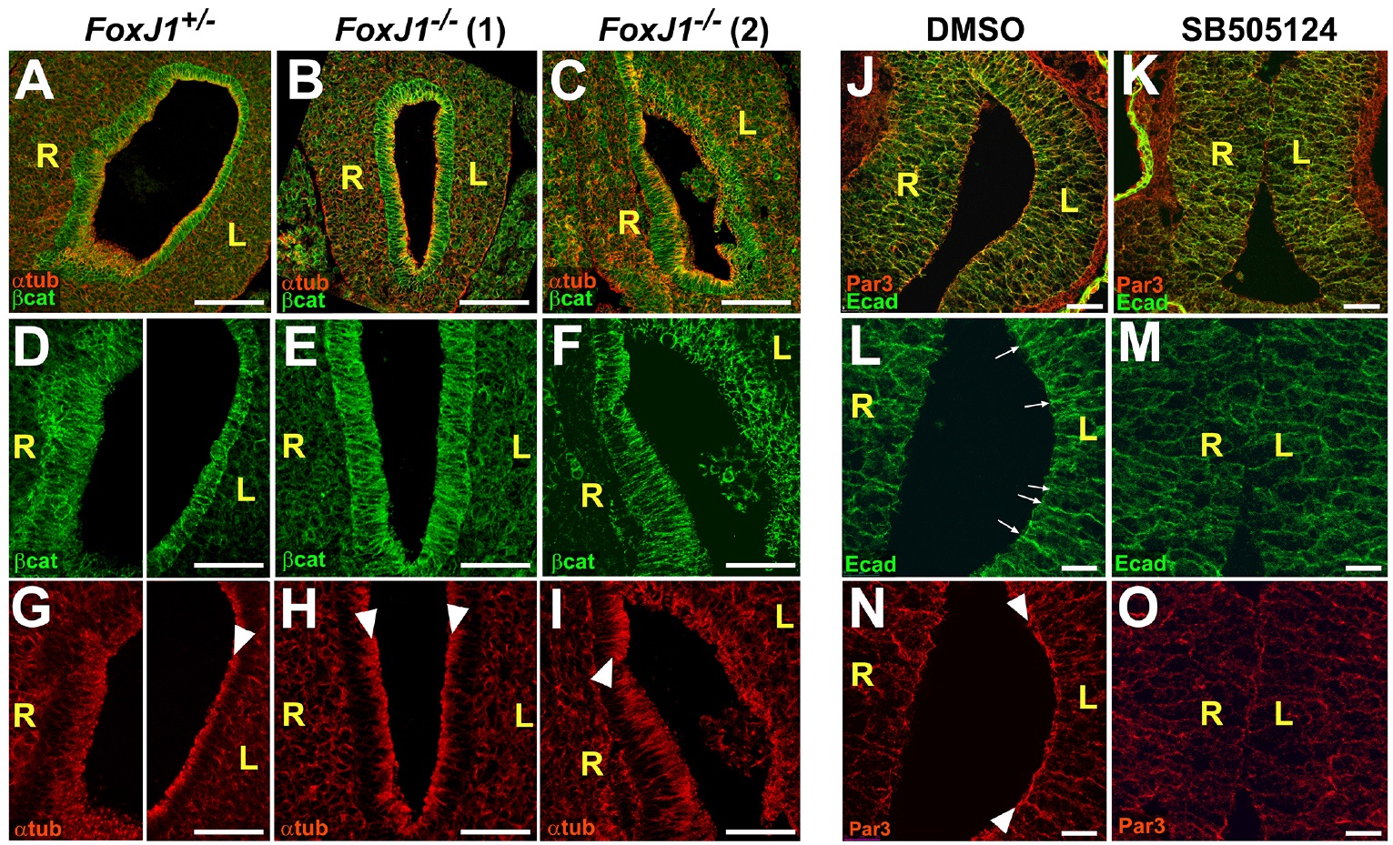 Fig. 3. Asymmetries in stomach epithelial polarity are regulated by left-right signaling. Stomach sections immunostained for α-tubulin (αtub, red) and β-catenin (β-cat, green) in the E11.5 mouse (A-I), or Par3 (red) and E-cadherin (Ecad, green) in the stage 39 frog (J-O), reveal left-right differences in endoderm morphogenesis. In the posterior stomach of Foxj1+/â mice, right endoderm is irregular, whereas left endoderm is more organized (D) and highly polarized, as indicated by tight apical concentration of α-tubulin (αtub, red; arrowhead, G). Both walls of Foxj1â/â mutant embryo [Foxj1â/â(1), B,E,H], comprise polarized cells with tight apical concentration of αtub (arrowheads, H); both sides resemble control left epithelium. In another mutant [Foxj1â/â(2), C,F,I] both sides are irregular and resemble control right epithelium, although sub-regions exhibit greater organization and polarity (arrowhead, I). In control (DMSO) frog embryos (J,L,N), left endoderm is more polarized than right, as indicated by enrichment of E-cadherin (Ecad; green) at apical adherens junctions (arrows, L), and the concentration of the apical polarity marker Par3 at the lumenal surface (red; arrowheads, N). By contrast, SB505124 (K,M,O) results in right isomerism, with left endoderm resembling right endoderm, as indicated by absence of apical enrichment of E-cadherin (M) and Par3 (O). L, left; R, right. Scale bars: 100 μmin A-C; 50 μm in D-K; 25 μm in L-O. (See Fig. S4 for higher magnification images.) |