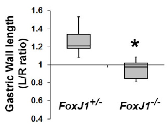 Figure S1. The normal left/right ratio of the lengths of the stomach walls is eliminated in E11.5 FoxJ1-/- mouse stomachs (* denotes p<0.01). |