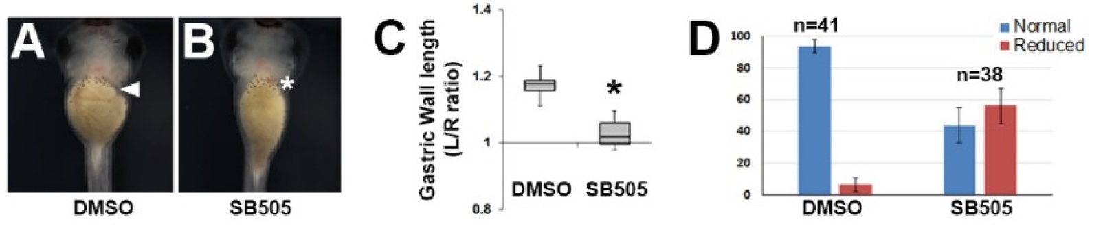 Figure S2. SB505124 exposure inhibits stomach curvature. Stage 19/20 frog embryos were exposed to DMSO (A) or 5uM SB505124 (B) through stage 42. C) The normal left/right (L/R) ratio of the lengths of the stomach walls is eliminated in SB505124-dosed embryos (* denotes p<0.01). The graph (D) indicates the percentage of embryos in which the greater curvature of the stomach is normal (e.g., arrowhead in A) or reduced/absent (* in B). |