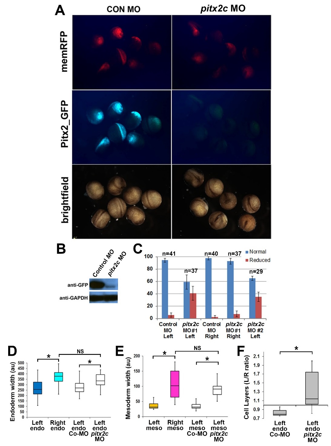 Figure S6. Specificity and efficacy of the pitx2c MO. A) Xenopus embryos (8-cell stage) were injected with 8 ng Control or pitx2c MO plus 200pg RFP mRNA and GFP mRNA (fused with pitx2c 5â UTR MO target site), and cultured until stage 20. Effective translation, indicated by GFP fluorescence, is visible in embryos injected with Control MO, but not with Pitx2c MO; RFP (which does not contain the pitx2c 5â UTR sequence) levels remain unaffected. B) Western blot confirms drastic reduction of GFP protein levels in embryonic extracts from pitx2c-MO- but not Control-MO-injected embryos. GAPDH, loading control. C) The graph indicates the frequency (percentage) of embryos in which the greater curvature of the stomach is normal or reduced/absent when Control MO or pitx2c-MO (#1) is targeted to either the left or right side. A second, independent MO (pitx2c MO #2) confirmed the result. While injection of Control MO has no effect on the relative thickness of the left endoderm (D) or mesoderm (E), pitx2c-MO-injected tissues are similar in thickness to the normal (nonpitx2c- expressing) right tissues (i.e., not significantly different, NS). F) The L/R ratio of endoderm cell layers is significantly increased in pitx2c-MO-injected stomachs, compared to Control-MO. * denotes p<0.01 |