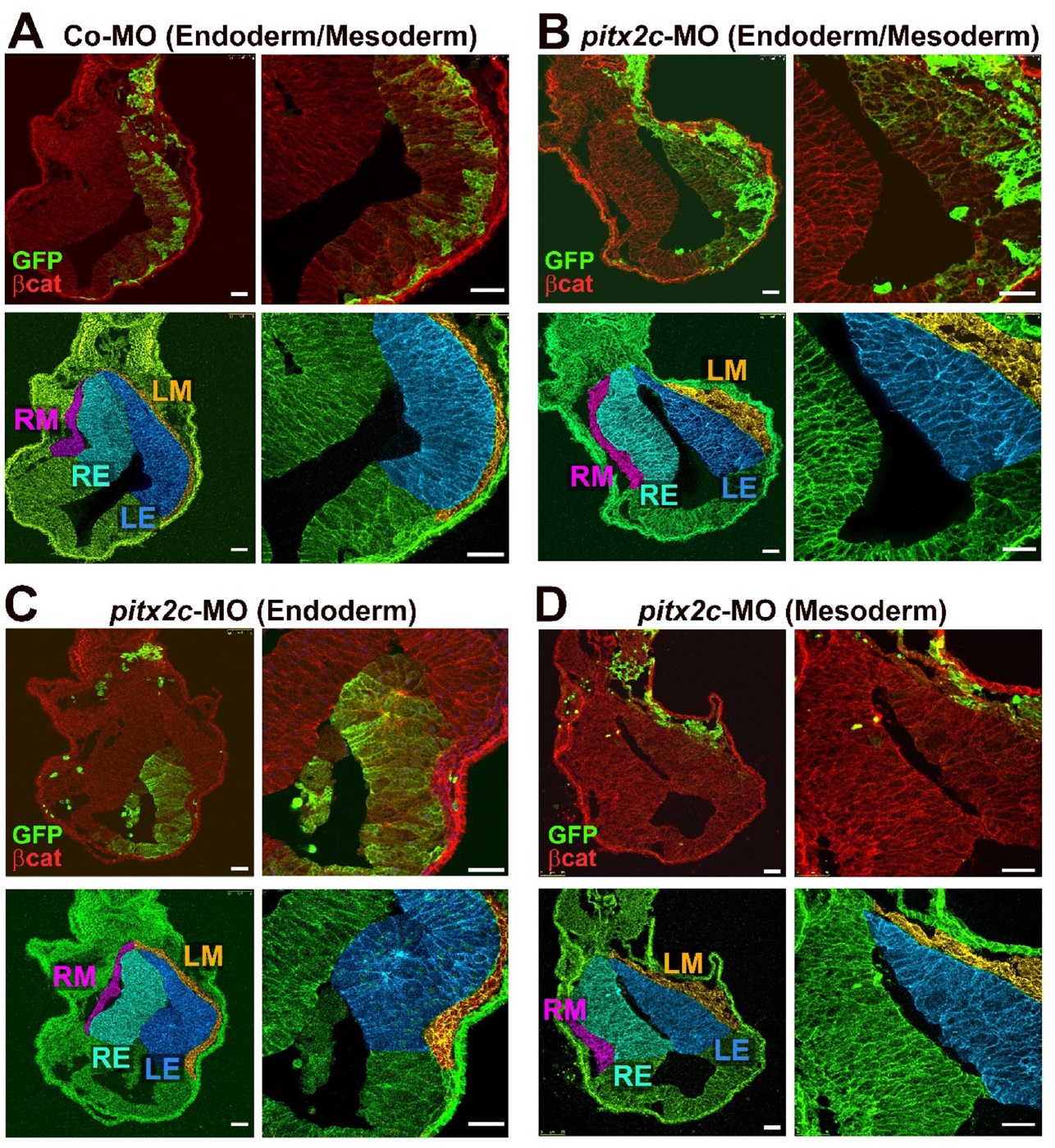 Figure S7. Reciprocal endoderm-mesoderm interactions affect morphogenesis of the left stomach wall. Frog embryos were injected with GFP mRNA and either control morpholino (Co-MO; A) or pitx2c-MO (B-D), targeted to the left side of the stomach. Top panels: sections through the stomach were stained for ï¢-catenin (ï¢cat; red) and GFP (green). Bottom panels: the same sections were false color-coded as in Fig. 1(b) to highlight the relevant tissue layers (RE, right endoderm; LE, left endoderm; RM, right mesoderm; LM, left mesoderm). In the embryo shown in A, Control-MO is distributed throughout the LE and LM of the left stomach wall, which exhibits normal left side tissue architecture. In the embryo shown in B, pitx2c-MO is distributed throughout the LE and LM, and both tissue layers are abnormally thickened and/or disorganized. In C, pitx2c-MO is present predominately in the LE, with minimal contribution to the LM; yet, both the LE and LM are abnormal. Likewise, in D, pitx2c-MO is present only in the LM, with minimal contribution to LE, but both LE and LM are abnormal. |