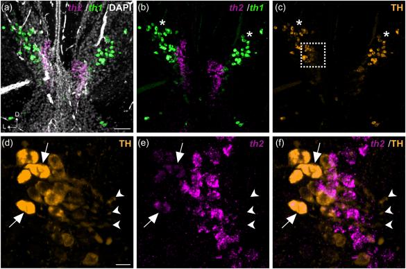 Filippi, Expression of the paralogous tyrosine hydroxylase encoding genes th1 and th2 reveals the full complement of dopaminergic and noradrenergic neurons in zebrafish larval and juvenile brain. 2010, Pubmed
