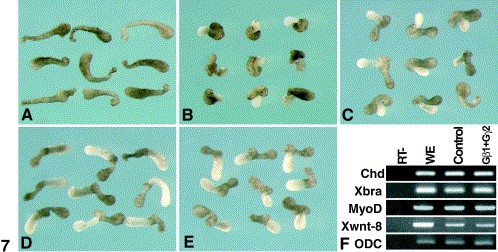 Fig. 7. Expression of exogenous Gβ1 and Gγ2 subunits inhibits convergent extension in a Cdc42-dependent way. Messenger RNA encoding Gβ1 and Gγ2 was microinjected alone or in combination with N17 Cdc42, Gαi2, or Gαt mRNA. Activin-treated animal cap elongation was scored as described in Fig. 5 (AâE). Elongation observed in uninjected controls (A) is significantly inhibited as a result of Gβ1γ2 expression (B). Coexpression of N17Cdc42 (C) clearly restores elongation. Elongation inhibition caused by Gβ1γ2 expression is also rescued by Gαi2 (D) or Gαt (E), showing that it specifically results from the hyperactivation of Gβγ signaling. (F) RT-PCR analysis of mesodermal marker gene expression. Expression of mesodermal markers in response to activin treatment is not modified by Gβ1γ2 expression, indicating that Gβ1γ2 expression directly affects morphogenetic movements and not tissue specification.