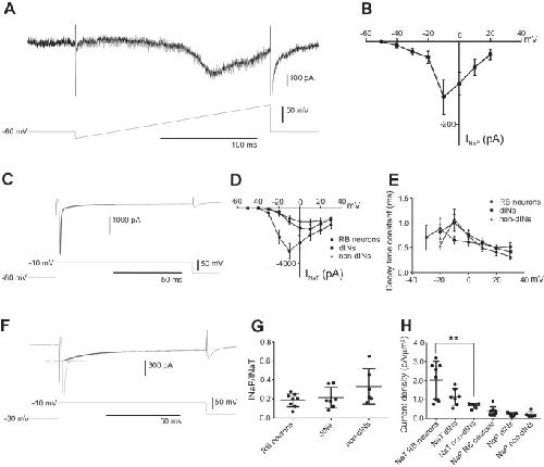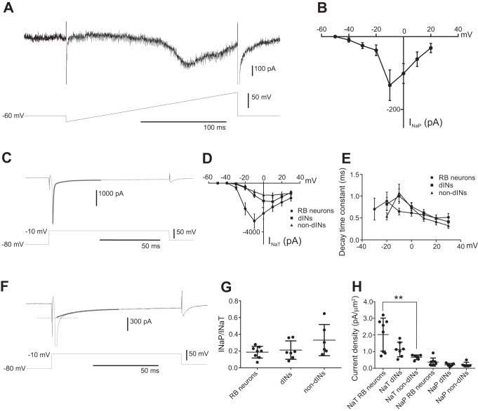 Fig. 1. Measurements of INaT and INaP in spinal neurons. A: voltage ramp in an RB neuron reveals INaP. B: current-voltage (I-V) curve of INaP in RB neurons measured from the ramp currents (n = 8). C: sodium currents in an RB neuron evoked by a voltage step to −10 mV. The thick gray curve shows the double-exponential fitting of the decay of the currents. D: I-V curves of INaT in RB neurons, dINs, and non-dINs. E: decay time constants of the INaT at steps to different voltages in the 3 neuron groups. F: single-exponential fitting (thick gray curve) of the slowly decaying currents. Dotted line indicates estimation of INaP at the peak of combined sodium currents. G: ratios of INaP to INaT in RB neurons, dINs, and non-dINs. H: current densities for INaT and INaP in RB neurons, dINs, and non-dINs. **P < 0.01.