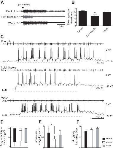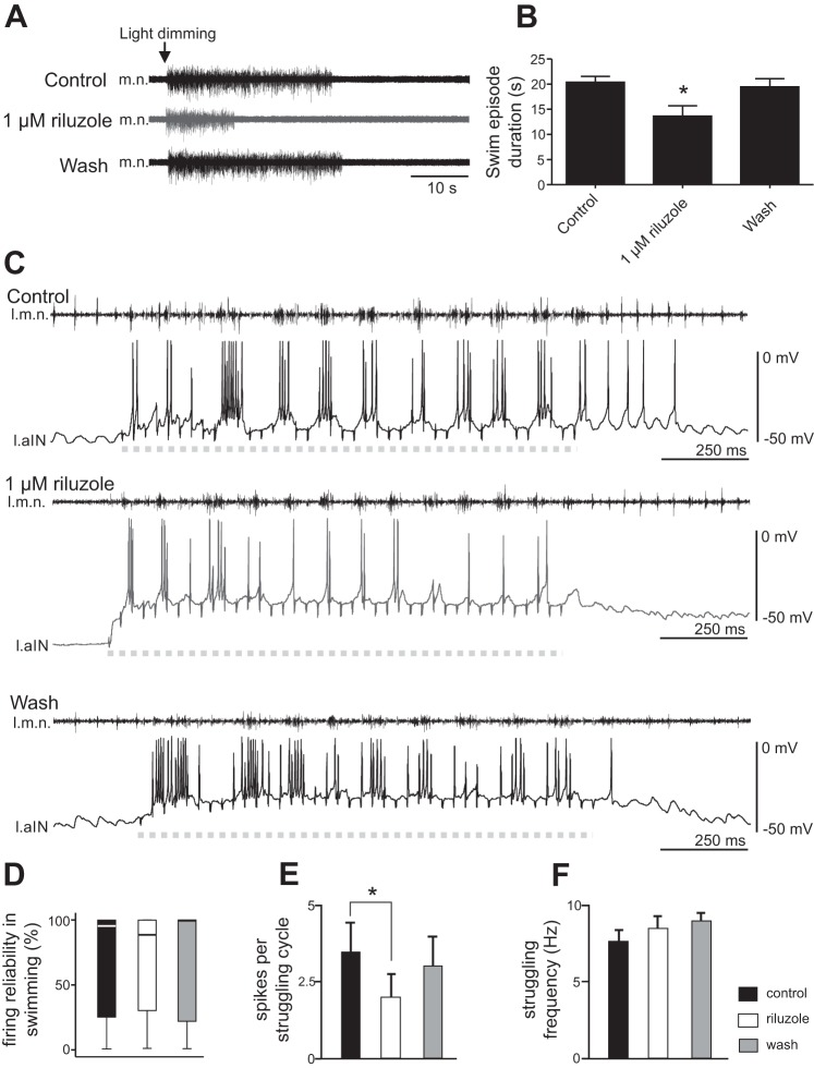 Fig. 4. Effects of 1 µM riluzole on fictive swimming and struggling. A: motor nerve (m.n.) recordings during swimming evoked by light dimming in control, 1 µM riluzole, and after washout. B: reduction of the swimming episode duration by 1 µM riluzole (n = 5; *P < 0.05). C: effects of riluzole on the number of spikes on each struggling cycle. Dashed gray lines indicate periods of repetitive skin stimulation at the rostral trunk (40 pulses at 30 Hz), used to evoke fictive struggling. l.m.n., motor nerve recording from left side; l.aIN, ascending interneuron recording from left side. D: riluzole does not affect the firing reliability of neurons in swimming (% of cycles with spiking). E: riluzole reduces the number of spikes per struggling cycle (*P < 0.05). F: struggling frequencies are not affected by riluzole.