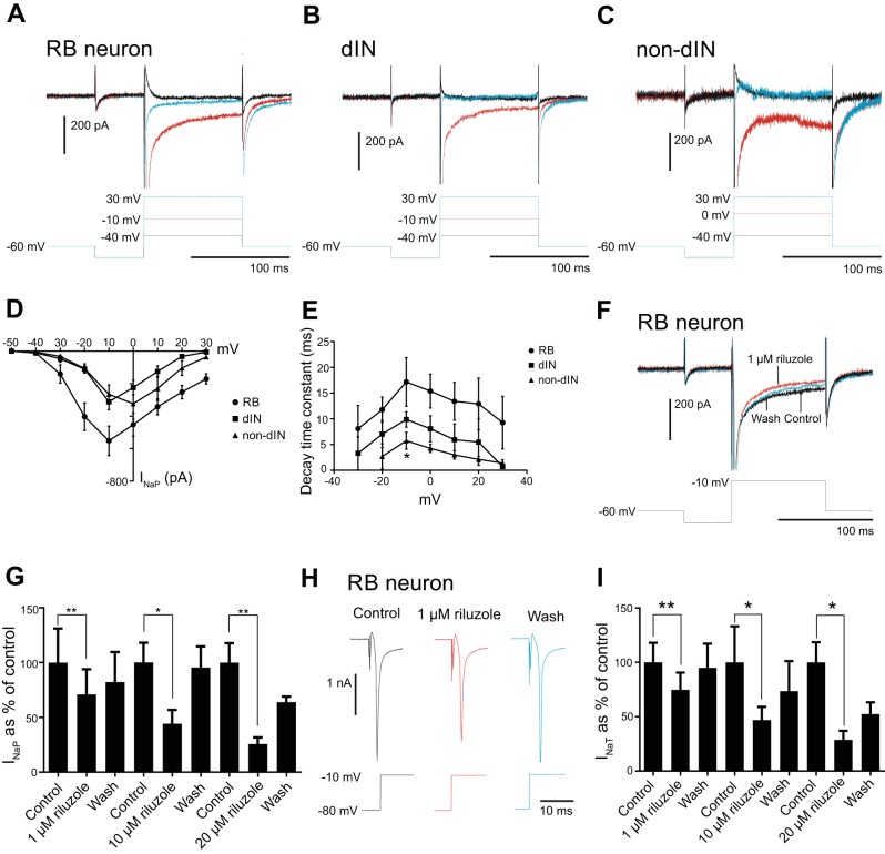 Fig. 2. Properties of INaP in the 3 neuron groups and the effect of riluzole. A–C: sodium currents in an RB neuron (A), a dIN (B), and a non-dIN (C) in response to voltage step to −40 (black traces), −10, or 0 mV (red traces showing the maximal INaP) and to 30 mV (blue traces). D: averaged I-V curves for the INaP in RB neurons, dINs, and non-dINs. E: decay time constants of INaP at steps to different membrane potentials in RB neurons, dINs, and non-dINs. F: effect of 1 µM riluzole on INaP in an RB neuron. G: blocking effects of 1, 10, and 20 µM riluzole on INaP. H: effect of 1 µM riluzole on INaT in an RB neuron. I: effect of 1, 10, and 20 µM on INaT. *P < 0.05; **P < 0.01.