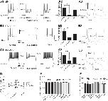 Fig. 3. Effects of riluzole on firing properties of the 3 different neuron groups. A1: effect of 1 µM riluzole on the rebound firing in a dIN. A2: bar chart summarizing the reduction of rebound spikes in dINs (n = 6). A3: subthreshold depolarization and firing at threshold level in a dIN in control (left), 1 µM riluzole (**P < 0.01; middle), and wash (right). B1: effect of riluzole on an RB neuron with slow, repetitive firing. B2: bar chart showing the reduction of spikes by riluzole (n = 3). B3: subthreshold depolarization and firing at threshold level in an RB neuron in control (left), 1 µM riluzole (middle), and wash (right). C1: effect of riluzole on the repetitive spiking in a non-dIN. C2: reduction of number of spikes by riluzole (n = 9). C3: subthreshold depolarization and firing at threshold in a non-dIN in control (left), 1 µM riluzole (middle), and wash (right). D: effect of riluzole on the spike thresholds in RB neurons (n = 6), dINs (n = 4), and non-dINs (n = 5). *P < 0.05; **P < 0.01; ***P < 0.001. E: lack of effects of riluzole on spike amplitudes in RB neurons, dINs, and non-dINs. F: lack of effects of riluzole on input resistances in RB neurons, dINs, and non-dINs.
