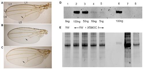 Figure 1—figure supplement 1. Pent constructs are biologically active in Drosophila, but XSMOC-1 protein is not detected in Drosophila following mRNA overexpression. (A–C) Adult Drosophila longitudinal wing vein (L1 to L5) patterns in (A) wild type; arrow indicates the position of the anterior crossvein between L4 and L5. (B) pent2-5/pentA17 mutant lacking pent where L5 is missing (C) Rescue of pent2-5/pentA17 phenotype by expression of Pent in a pent2-5/pentA17 background using the UAS/Gal4 system with brinker (brk)/Gal4 as the driver. (D) Immunoblot of Drosophila embryo extracts (10 μg/lane) from control yellow white (YW) Drosophila embryos spiked with XSMOC-1 (Lanes 1–5) as indicated, XSMOC-1 only (Lane 6), or Drosophila lines 4 (Lane 7) and 5 (Lane 8) overexpressing XSMOC-1 mRNA. (E) Coomasie-stained SDS-PAGE gel following protein transfer shown in (D), showing residual protein. The amount of protein in lane seven is notably more than that in other lanes, but the XSMOC-1 signal is nevertheless undetectable. DOI: http://dx.doi.org/10.7554/eLife.17935.004 |