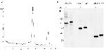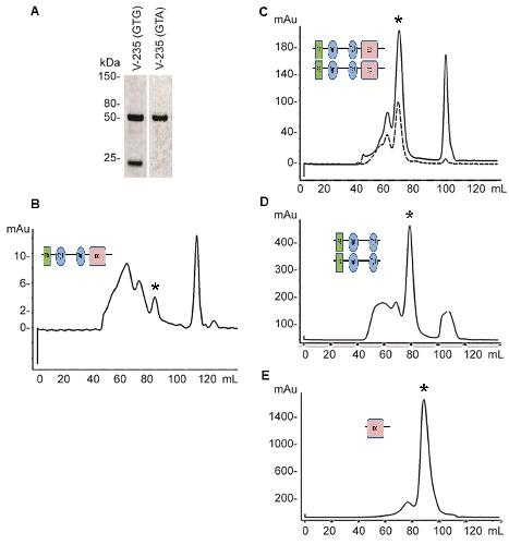 Figure 2. Expression and refolding of recombinant mature XSMOC-1, XSMOC-1∆EC, and XSMOC-1EC. (A) Coomassie stained SDS-PAGE of wild type (V235-GTG) and silent mutant (V235-GTA) recombinant mature XSMOC-1 following size exclusion chromatography (SEC). The product migrating at 24 kDa is a partial XSMOC-1 sequence beginning at the cryptic start site encoded by GTG at V235. (B–E) Solid lines: SEC profiles obtained following refolding of XSMOC-1 (B, C), XSMOC-1∆EC (D) and XSMOC-1 EC (E) either in the absence (B) or presence of 2 mM Calcium Chloride (C–E). Dashed line: SEC profile (C) obtained for human SMOC-1 refolded in the presence of calcium. Asterisk symbols indicate the peaks corresponding to each schematic diagram. DOI: http://dx.doi.org/10.7554/eLife.17935.006 |