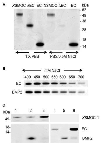 Figure 5. XSMOC-1EC and BMP2 have similar binding affinities for heparin sepharose (HS), but do not bind to each other. SDS-PAGE analysis (Coomassie staining) of HS elution profiles showing (A) binding of XSMOC-1, XSMOC-1∆EC, and XSMOC-1EC in PBS or PBS/0.5M NaCl; binding of XSMOC-1 to HS requires the EC domain. (B) XSMOC-1EC and mature BMP2 (A284-R396) in a NaCl gradient (400–700 mM) have equivalent HS binding affinities. (C) BMP2 does not bind directly to XSMOC-1 (lanes 1–3) or XSMOC-1EC (lanes 4–6) at physiological ionic strength (PBS); BMP2 (4 μg) incubated with HS (0.3 μl) saturated with XSMOC-1 or XSMOC-1EC (6 μg), did not co-elute with XSMOC-1 or XSMOC-1EC (lanes 3 and 6) and was only present in the unbound fraction (lanes 2 and 5). Saturation of HS by XSMOC-1 and XSMOC-1EC was confirmed by their presence in the unbound fractions (lanes 1 and 4) prior to incubation with BMP2. DOI: http://dx.doi.org/10.7554/eLife.17935.011 |