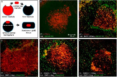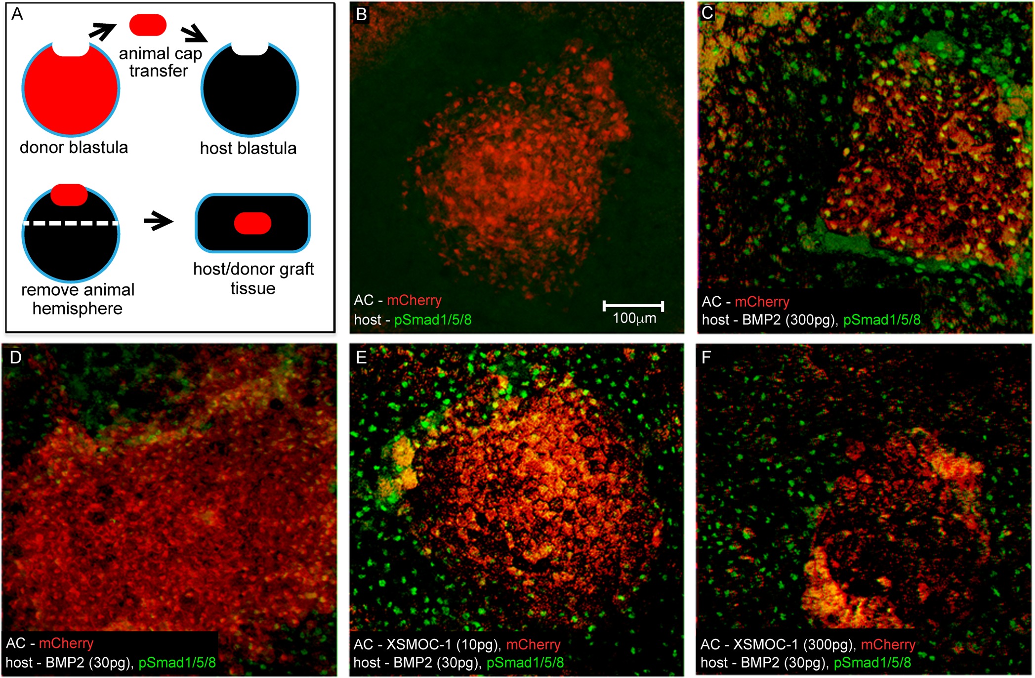 Figure 7. In vivo assay demonstrating that XSMOC-1 can expand the range of BMP2 signaling. (A) Schematic diagram of the host/donor animal cap (AC) transfer assay. (B–F) Donor AC grafts expressing mCherry (red) and host/donor immunofluorescent nuclear staining of pSmad 1/5/8 (green). (B) Control host + mCherry mRNA (200 pg)-injected donor AC (mCherry AC); endogenous pSmad is not detectable, (C) BMP2 mRNA (300 pg)-injected host + mCherry AC; pSmad is detected throughout the host tissue and donor AC, (D) BMP2 mRNA (30 pg)-injected host (BMP2-30 pg host) + mCherry AC; pSmad is detected in the host tissue and at the host tissue/AC boundary, (E) BMP2-30 pg host + mCherry/XSMOC-1 mRNA (10 pg)-injected AC; pSmad is detected in the host tissue and 4–5 cell diameters into the AC (F) BMP2-30pg host + mCherry/XSMOC-1 mRNA (300 pg)-injected AC; pSmad is not detected in the AC and is also absent at the host tissue/AC boundary. DOI: http://dx.doi.org/10.7554/eLife.17935.015 |