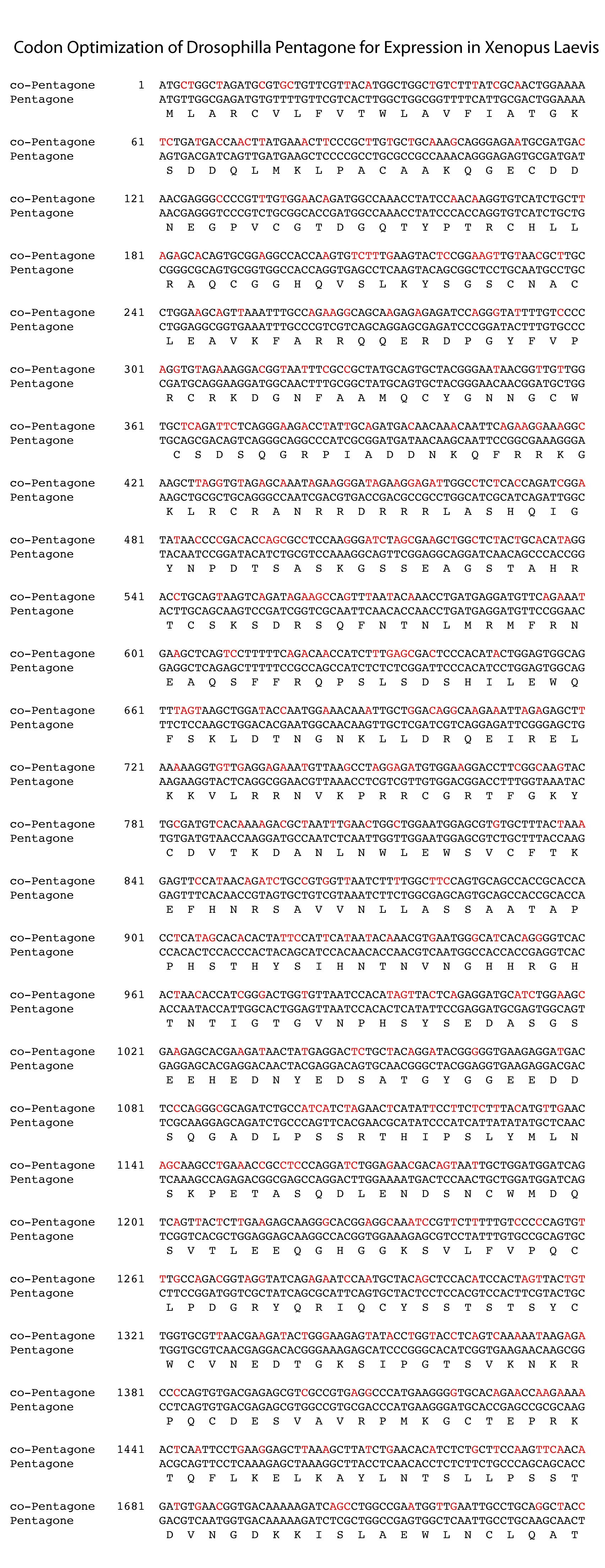 Figure 1—figure supplement 2. Nucleotide alignment of pentagone and codon optimized pentagone (co-pentagone). Amino acid identity is 100%; nucleotide identity is 73%. DOI: http://dx.doi.org/10.7554/eLife.17935.005 |