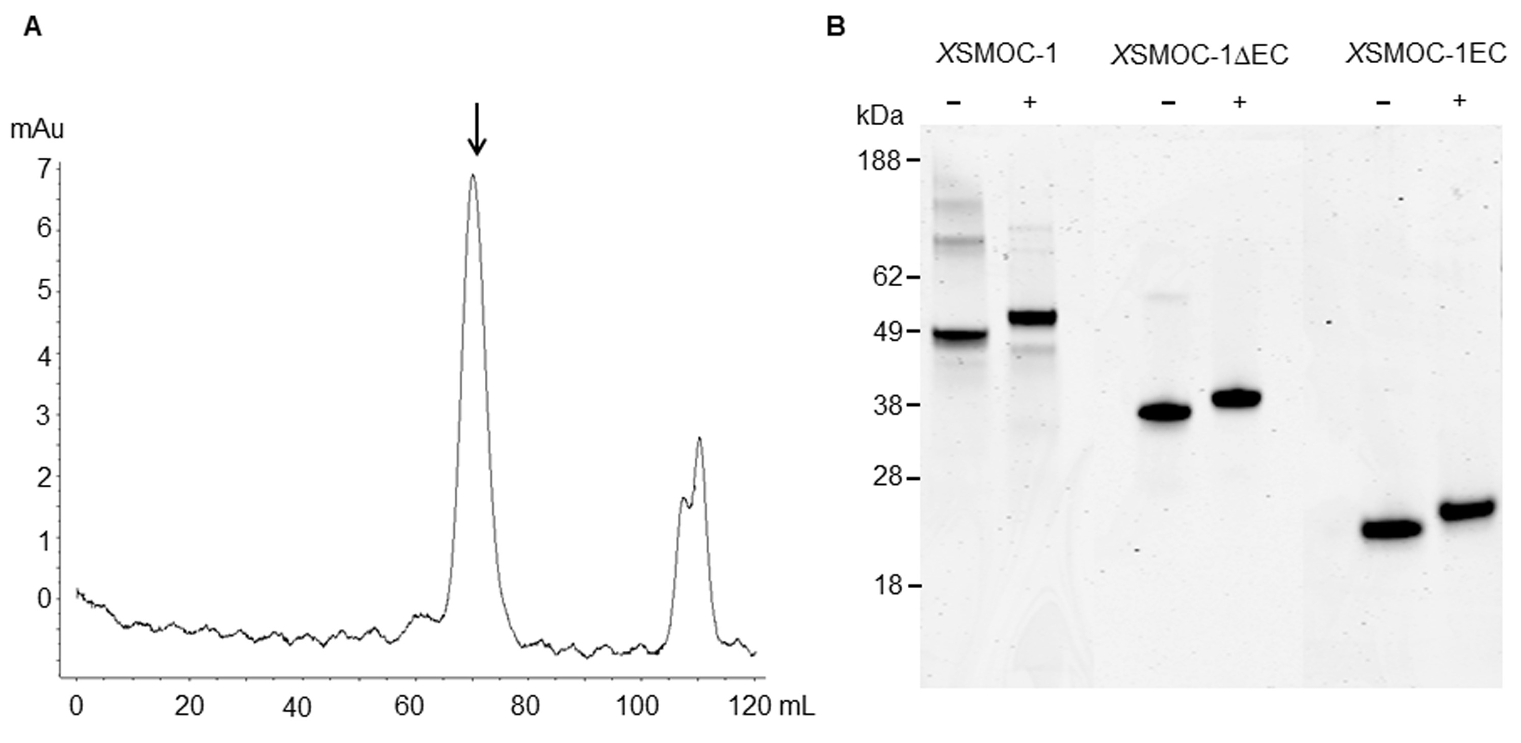 Figure 2—figure supplement 1. Dimeric XSMOC-1 is not dissociated by chelation or reduction. (A) SEC profile showing that XSMOC-1, refolded in the presence of 2 mM CaCl2, continues to migrate as a dimer (↓) upon the subsequent chelation of calcium ions by dialysis in the presence of 10.5 mM EDTA. (B) SDS-PAGE analysis of XSMOC-1, XSMOC-1 ∆EC, and XSMOC-1 EC in the presence (+) and absence (−) of β-mercaptoethanol shows that the XSMOC-1, XSMOC-1 ∆EC dimers are not linked by disulfide bonds. DOI: http://dx.doi.org/10.7554/eLife.17935.007 |