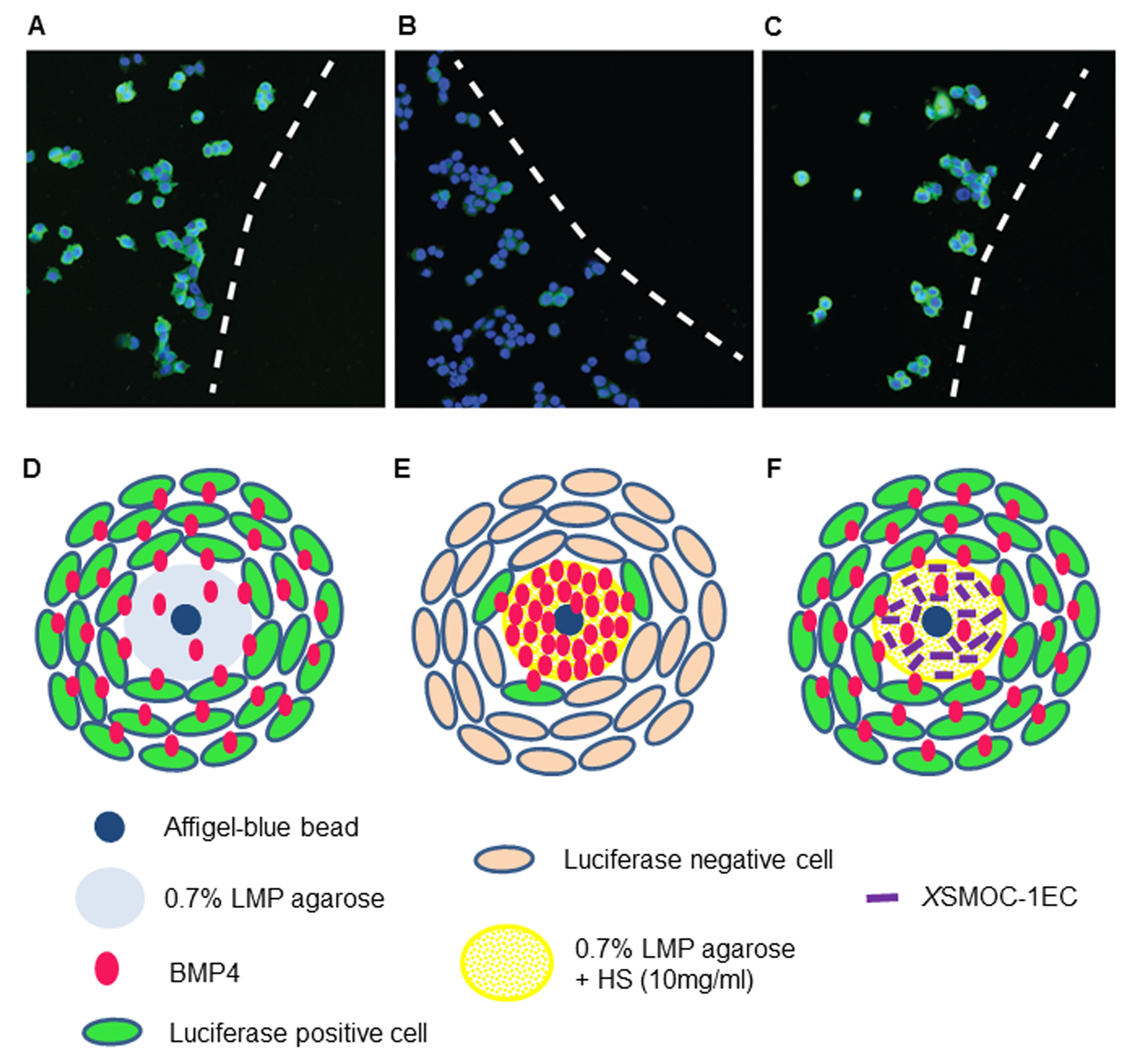 Figure 6. Immunofluorescence assay demonstrating that XSMOC-1 can promote BMP signaling at a distance from its source by competitive binding to HSPGs. BMP4-soaked beads (100 μm) were implanted into 0.5 μl drops of 0.7% low melting point (LMP) agarose (A, D), LMP agarose containing 10 μg/ml heparan sulfate (B, E), or LMP agarose containing heparan sulfate (10 μg/ml) and 100 μg/ml XSMOC-1EC (C, F) on 8-well chamber slides. C33A-2D2-09 cells, harboring luciferase under the control of a BMP response element (BRE) were seeded at 2 × 104 cells/well and incubated for 48 hr in serum-free medium. Luciferase immunofluorescence (green) indicates cells positive for BMP signaling. Cell nuclei (blue) were stained with DAPI. Dashed lines in A-C indicate the boundaries between C33A-2D2-09 cells and the agarose drops. Analysis of four fields of view in three separate experiments demonstrated the number of luciferase-positive cells to be lower (16% ± 8%) adjacent to matrices containing HS alone (B, E) compared to those containing both HS and XSMOC-1EC (69% ± 26%) (C, F). Representative fields are shown. DOI: http://dx.doi.org/10.7554/eLife.17935.013 Figure 6—source data 1. Percentage of luciferase positive cells per field of view. The number of Luciferase positve cells in five fields of view were calculated as a percentage of the total number of cells in each field. DOI: http://dx.doi.org/10.7554/eLife.17935.014 Download source data [figure-6—source-data-1.media-2.docx] |