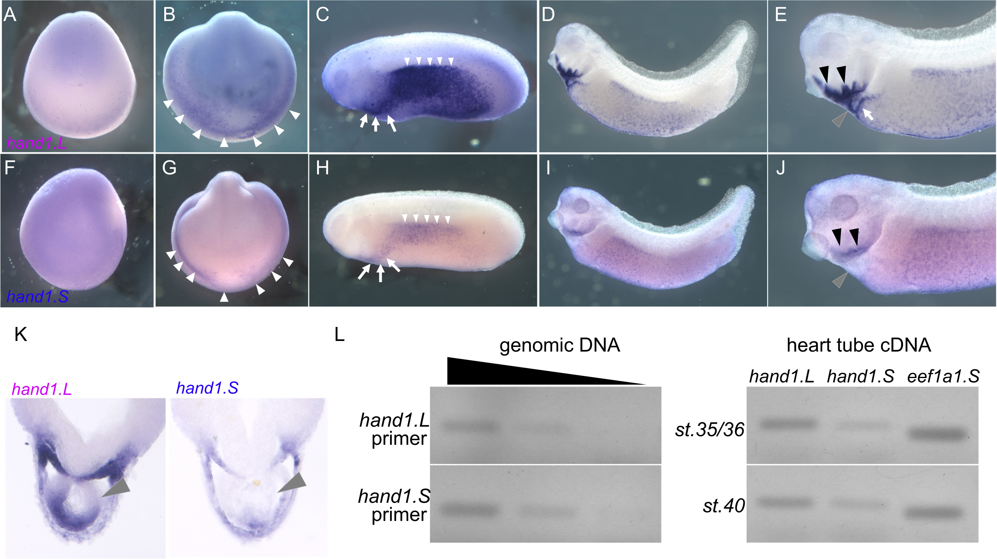 Developmental expression of hand1.L and hand1.S in Xenopus laevis. (AâK) The whole embryos showing expression at stages 15 (A and F), 17 (B and G), 19 (C and H), and 35/36 (D and I), and their high-magnification images (E and J). Cross-section showing heart at stage 35/36 (K). White arrowhead: epidermal cells; white arrow: anteriorventral portion; gray arrowhead: heart; black arrowhead: branchial arches. (L) RT-PCR analysis of hand1.L and hand1.S. The amplification efficiency of each primer pair was confirmed using genomic DNA from J-strain (5 ng, 1 ng, and 0.2 ng, respectively). RT-PCR was performed with cDNA from the heart tubes. Eukaryotic translation elongation factor 1 alpha 1/EF-1 alpha (eef1a.S) was used as internal control.