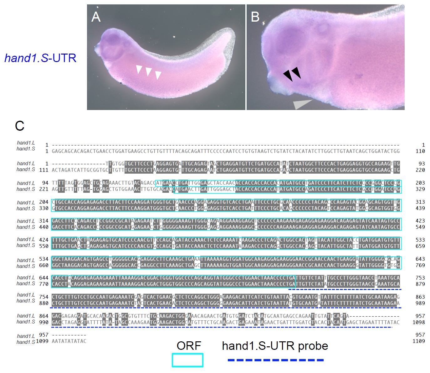 Supplementary materialSupplementary Fig 2. (A-B) The whole embryos showing expression at stages 35/36 and their high-magnification images. (C) The aligned nucleotide sequences of hand1. L and hand1. S and the target sequences for hand1. S-UTR probe are indicated by the dotted blue lines. White arrowhead: epidermal cells; Gray arrowhead: heart; black arrowhead: branchial arches. We used the following sequences for cloning of hand1. S-UTR, taccgtcgacctcGATTGTTCTATTTGCCCTTGGG, atccactagttctagTACTGAATACAATTCTGGCTC. Primer linker sequences are shown in lowercase letters.