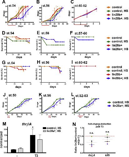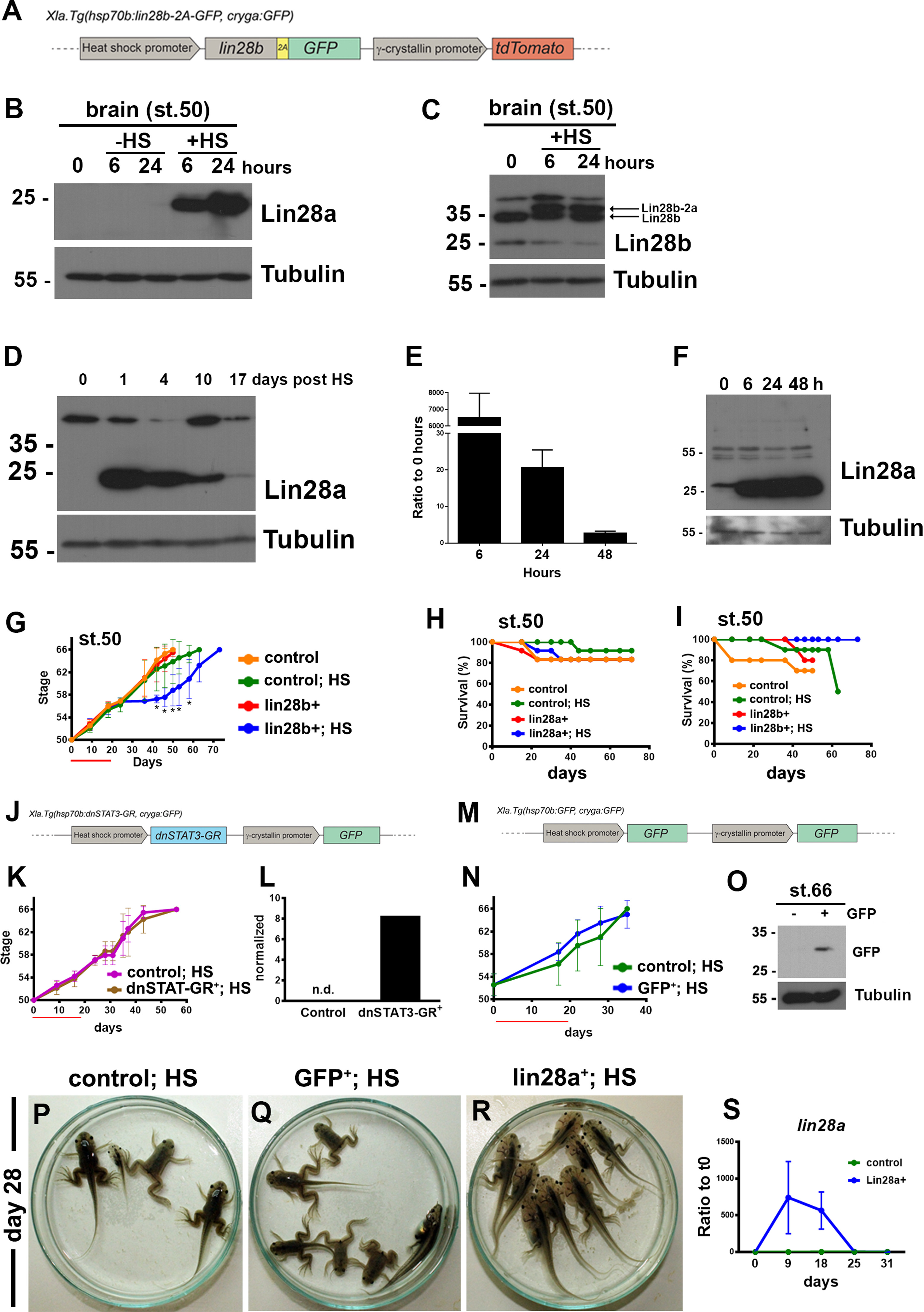 Supplementary material. Characterization of the overexpression of Lin28a, Lin28b and controls. (A) Construct used to generate lin28b transgenic animals. Heat shock promoter drives the expression of a transcript lin28b-2A-gfp that after translation is cleaved into protein Lin28b-2A and GFP. γ-crystallin promoter drives the expression of tdTomato. (B) Western blot for Lin28a of brain samples from st.50 lin28a+ animals without (-HS) or with heat-shock (+HS). A single heat-shock was done and samples were isolated at 6 and 24 h after the heat-shock. Control samples were isolated before the heat-shock (time 0 h). Tubulin was used as loading control. (C) Western blot for Lin28b of brain samples from st.50 lin28b+ animals with heat-shock (+HS). A single heat-shock was done and samples were isolated at 6 and 24 h after the heat-shock. Control samples were isolated before the heat-shock (time 0 h). Tubulin was used as loading control. Upper arrow shows the specific induction of Lin28b-2A after the heat-shock. Lower arrow shows the endogenous Lin28b. (D) Western blot for Lin28a of brain samples from st.56 lin28a+ animals with heat-shock (+HS). A single heat-shock was done and samples were isolated before the HS (day 0) and 1, 4, 10 and 17 days post HS. Tubulin was used as loading control. Lin28a is the lower band, which is specifically upregulated with the HS compared to a non-specific upper band. (E) RT-qPCR for lin28a from brain samples isolated from stage 50 lin28a+ animals before the HS (0 h) and after 6, 24 and 48 h after the HS. Expression was normalized to eef1αâ1 and compared to 0 h. (F) Western blot for Lin28a of tail samples isolated from stage 50 lin28a+ animals before the HS (0 h) and after 6, 24 and 48 h after the HS. Tubulin was used as loading control. (G) Effect of Lin28b on metamorphosis progression. Control and lin28b+ F1 animals were heat-shocked starting at st.50. Red bar indicates days of heat-shock treatment. Stages were determined according to morphology. ANOVA plus Tukey´s multiple comparison for each day. *significant difference between lin28a+; HS and the other conditions simultaneously with no significant difference for the other comparisons. (H-I) Survival was determined during the overexpression experiments for (H) Lin28a and (I) Lin28b. (J) Construct used to generate transgenic animals that overexpress a dominant negative form a STAT3 construct (dnSTAT3) fused to the glucocorticoid receptor (GR). Heat shock promoter drives the expression of dnSTAT3-GR and γ-crystallin promoter drives the expression of GFP. (K) Metamorphosis was evaluated according to morphology in F1 control and dnSTAT3-GR+ animals that received heat-shock from day 0 to day 18 (red bar). No significant difference was found between control and dnSTAT3-GR animals (t-test for each day). (L) RT-qPCR for gr of control and dnSTAT3+ animals. A single heat-shock was done to st.66 animals after experiment shown in panel H and RNA from brain was isolated at 18 h after the heat-shock. Expression was normalized to eef1α-1. No expression of gr was detected in control animals (n.d). (M) Construct used to generate transgenic animals that overexpress GFP. Heat shock promoter drives the expression of GFP and γ-crystallin promoter drives the expression of GFP. (N) Metamorphosis was evaluated according to morphology in F0 control and GFP+ animals that received heat-shock from day 0 to day 18 (red bar). No significant difference was found between control and GFP+ animals (t-test for each day). (O) Western blot for GFP of control (-) and GFP+(+) animals. A single heat-shock was done to st.66 animals after experiment shown in panel K and protein from brain was isolated at 18 h after the heat-shock. Tubulin was used as loading control. (P-R) Representative images of animals at day 28, starting heat-shock treatment at day 0 (st.50). Lin28a+; HS animals (R) were included in this experiment to confirm the effect of heat-shock. (S) RT-qPCR for lin28a from brain samples isolated from control and lin28a+ animals with HS from day 0 to day 18 starting at stage 50. Expression was normalized to eef1αâ1 and compared to day 0 (average ±SEM, n=3 independent experiments).
