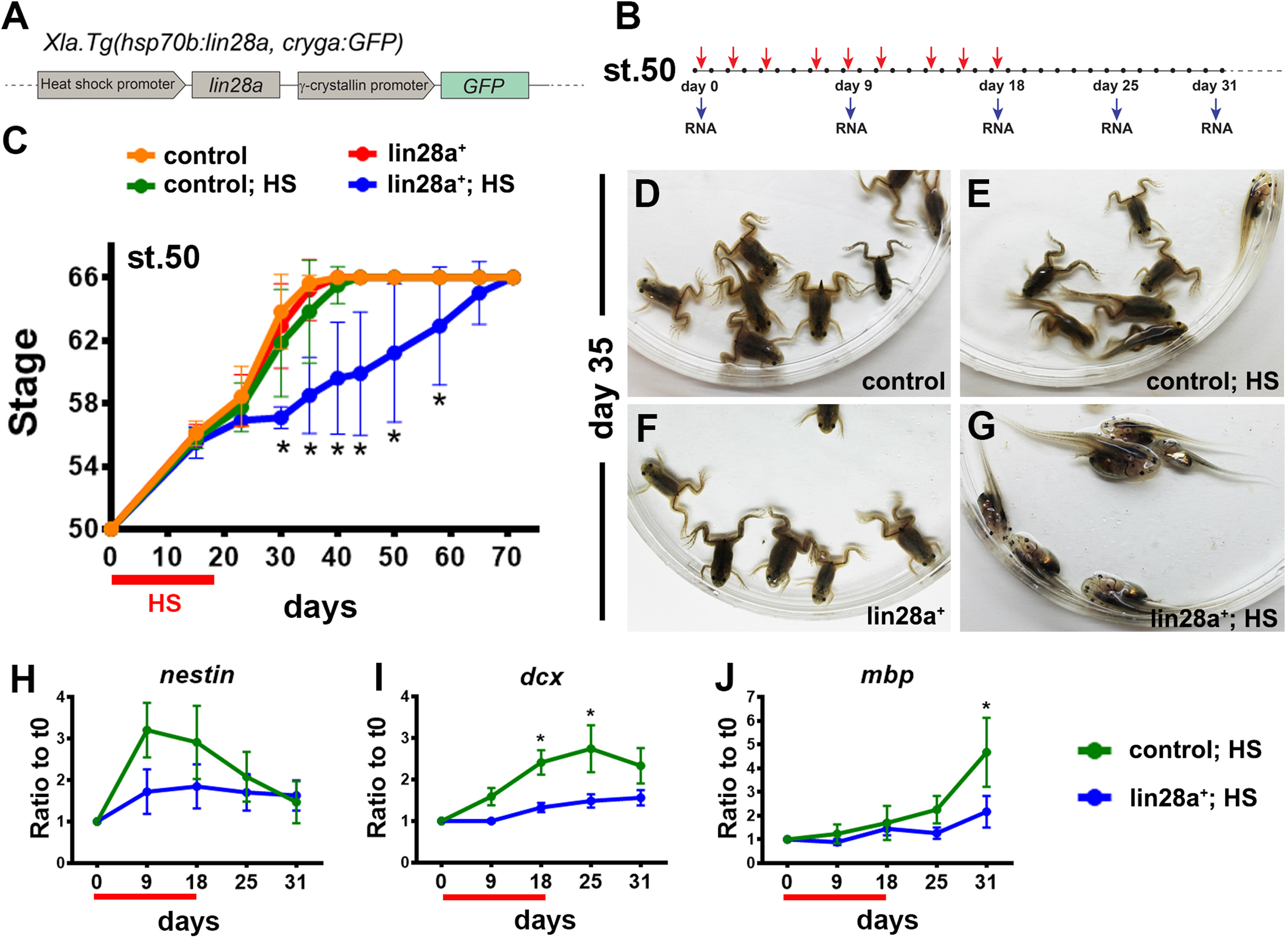 Overexpression of Lin28a delays metamorphosis. (A) Construct used to generate transgenic animals. (B) Experimental design to test the effect of Lin28 overexpression on metamorphosis. Red arrows indicate time of HS and blue arrows the time points of RNA isolation. (C) Metamorphosis progress (stages) of F1 non-transgenic siblings (control) and transgenic animals (lin28a+) without or with HS from day 0 to day 18 (red bar) starting at st.50. *significant difference between lin28a+; HS and the other three conditions simultaneously with no significant difference for the other comparisons (ANOVA plus Tukey´s multiple comparison for each day). (D-G) Representative images of animals at day 35 from the experiment depicted in panel C. (H-J) RT-qPCR for (H) nestin, (I) doublecortin (dcx) and (J) myelin basic protein (mbp) of brain samples isolated at different time points from control and lin28a+ animals that received HS (average ±SEM, n=3 independent experiments). *p<0.05, Two-way ANOVA plus Sidak´s multiple comparisons test .