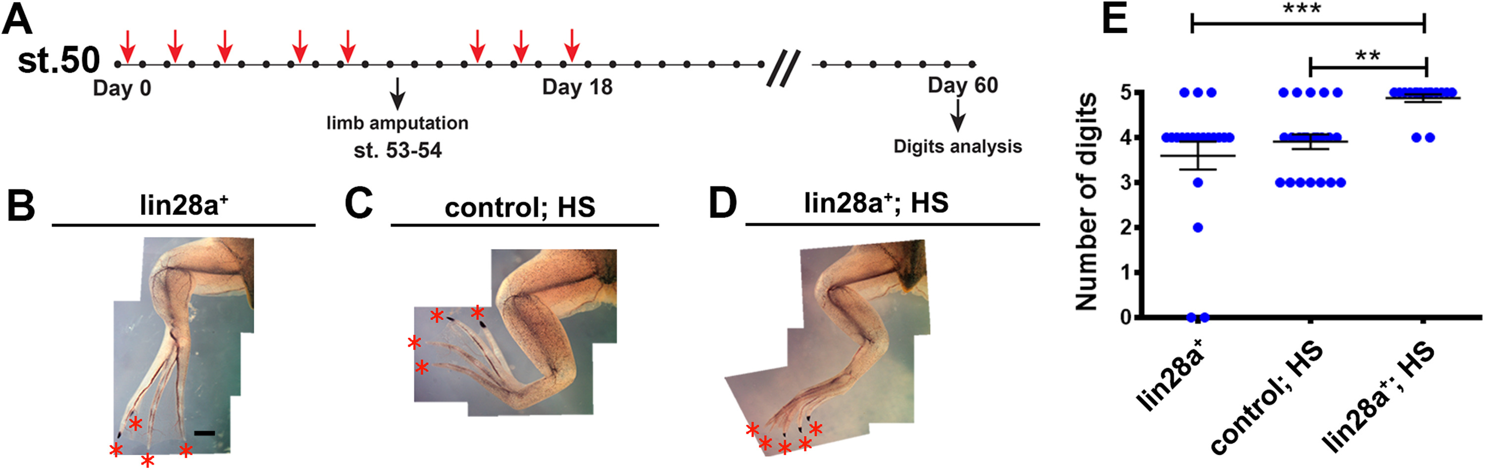 Overexpression of Lin28a improves digit regeneration after amputation. (A) Experimental design. Red arrows indicate time of HS. The number of digits (asterisks) was evaluated at day 60 in (B) transgenic animals without HS (lin28a+), (C) control animals with HS (control; HS) and (D) transgenic animals with HS (lin28a+; HS). (E) The results were quantified and summarized. **p<0.01, ***p<0.001 ANOVA plus Bonferroni´s multiple comparisons. |
